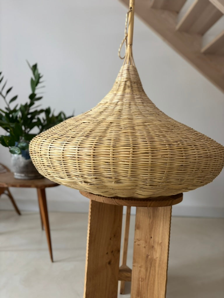 Fabriquée artisanalement au Maroc, cette suspension au format XXL (1 mètre de diamètre) est entièrement tressée à la main en fibres naturelles. Sa forme organique, inspirée des coiffes traditionnelles nomades, en fait une pièce maîtresse idéale pour habiller un salon, une véranda ou une terrasse couverte.